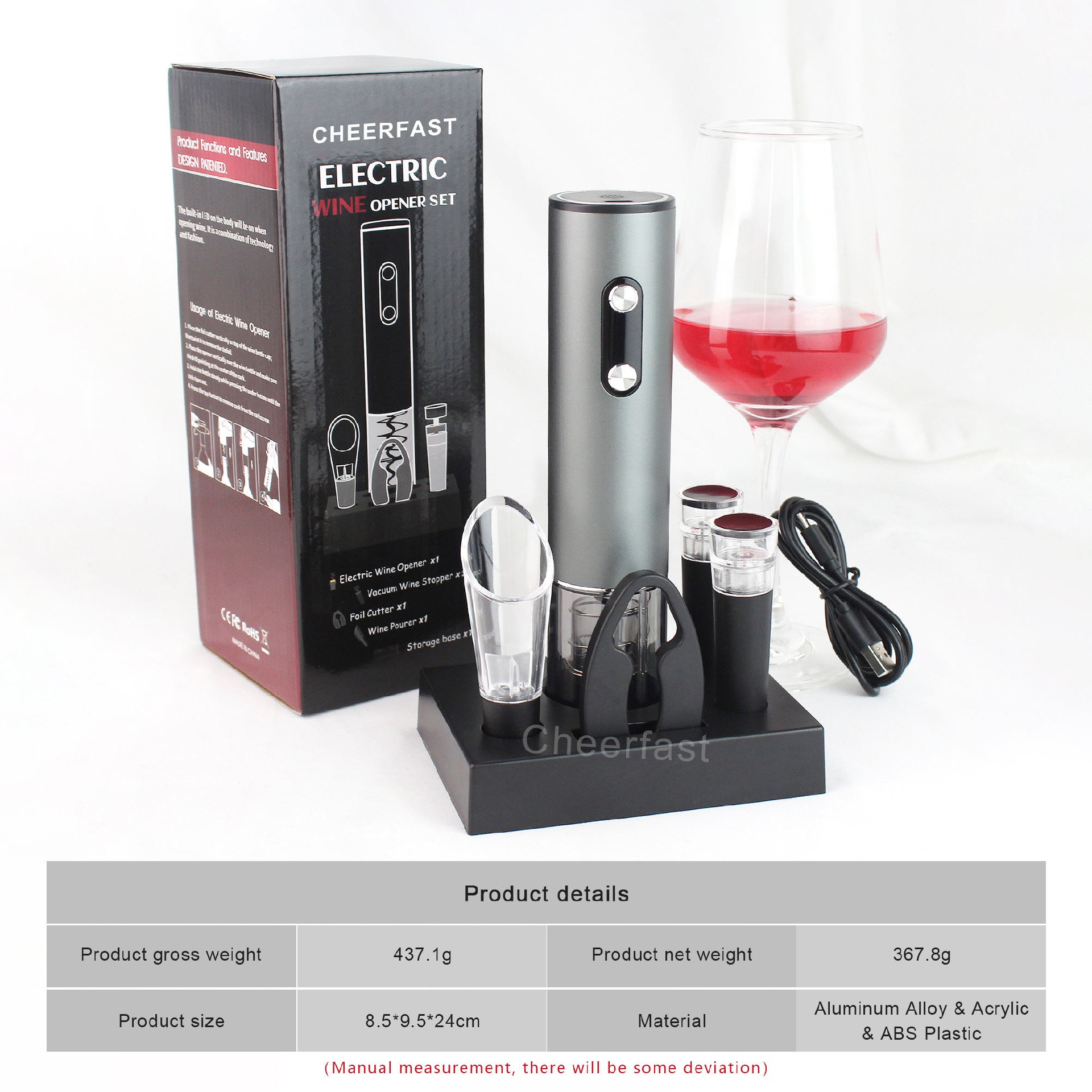 Wine Opener Kit: Electric Wine Bottle Opener Set includes 1pc storage base, 1pc foil cutter, 1pc wine pourer and 2pcs vacuum stoppers to preserve the freshness of your opened wine bottles.