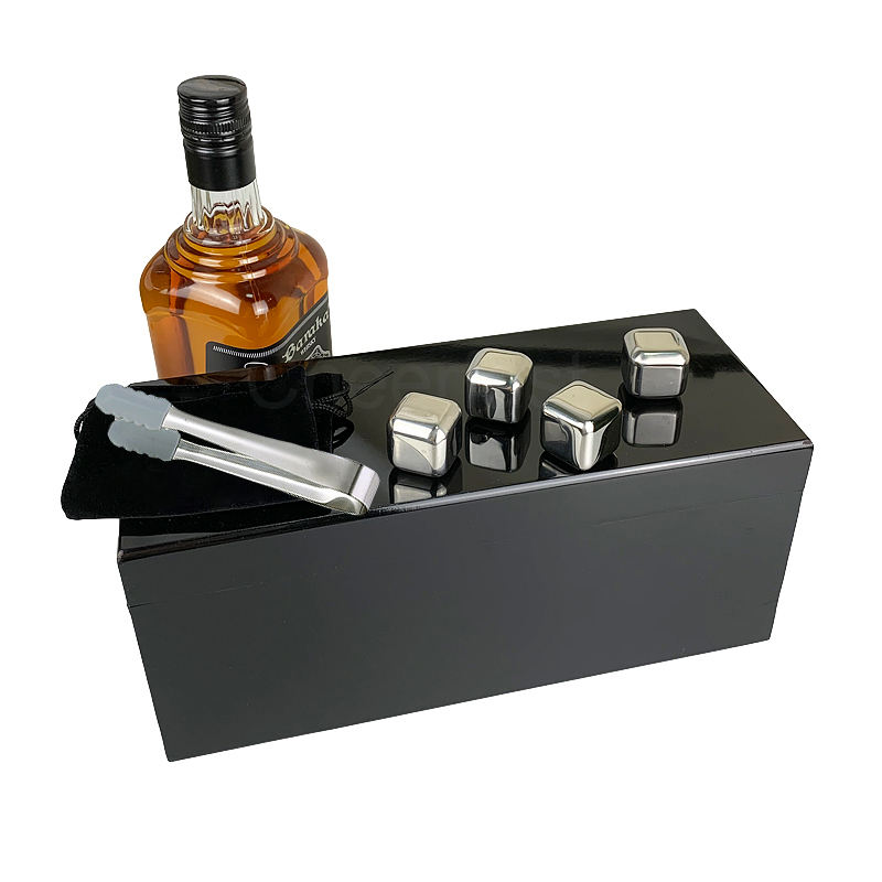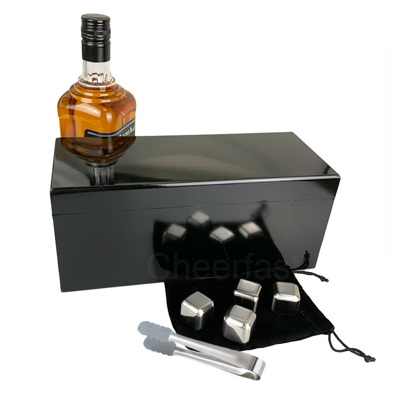 also have 4pcs stainless steel ice cubes and velvet pouch as well as tong inside, conveniently for your drink iced whiskey and storage wine. We support custom your color, size and logo box, if you will need to custom a wooden box for your products then please send us an inquiry.