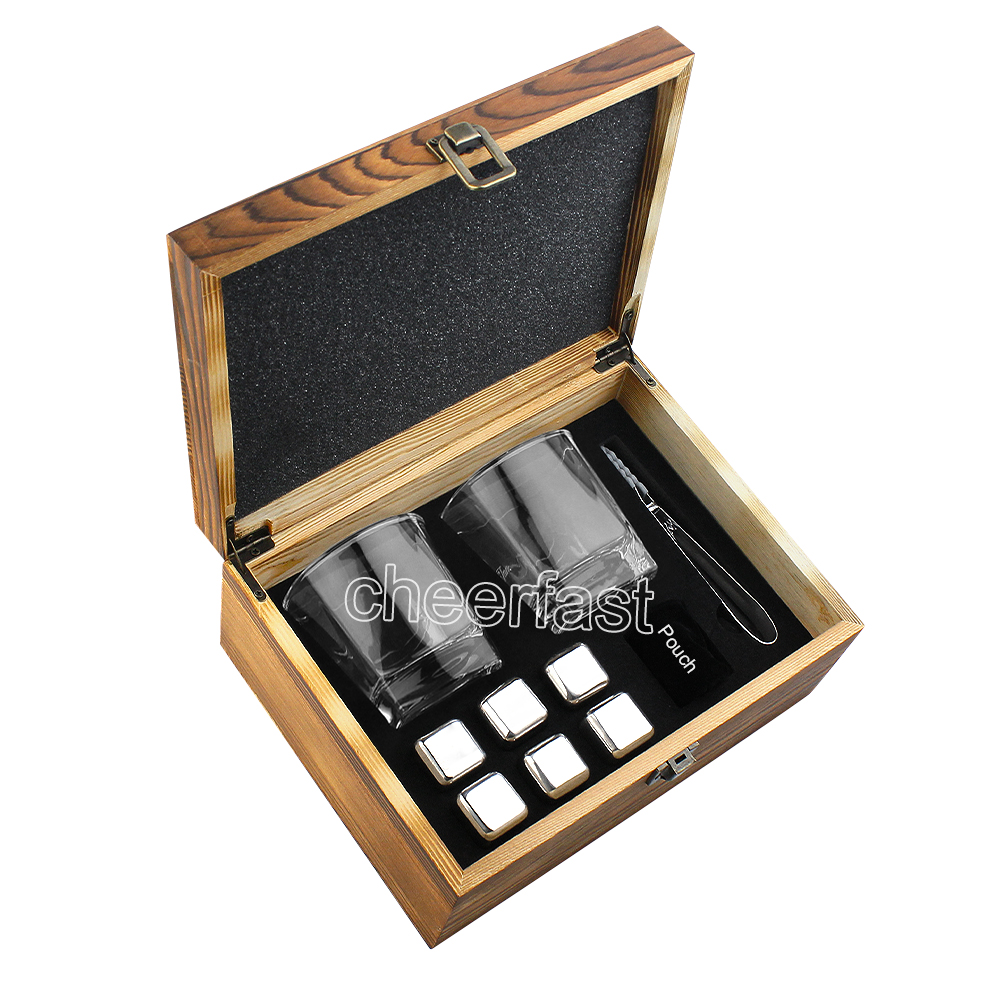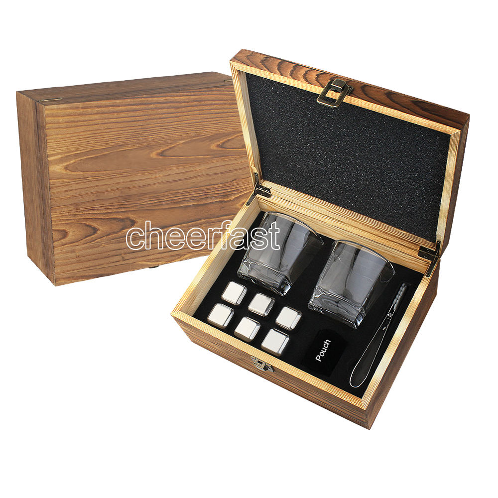 *COMPLETE PACKAGE - As a perfect whiskey gift for men dad husband, 6 stainless steel ice cubes, 2 crystal whiskey glasses , 1 tong and 1 black velvet bag (Easy to use and store), 1 Naturally burned pine wood box (very sturdy, protecting the product inside from damage during shipping.)