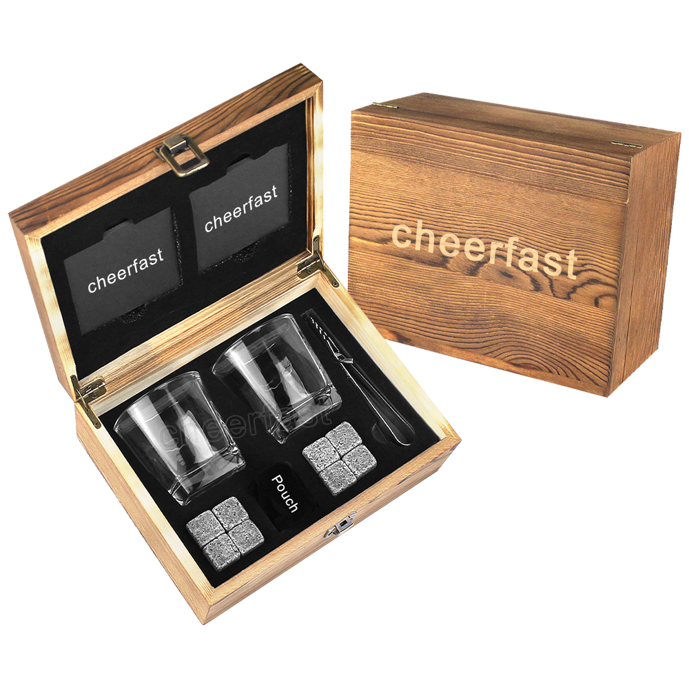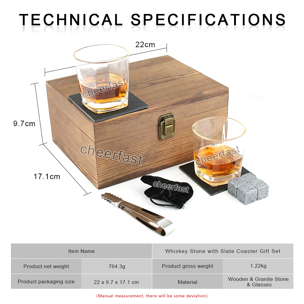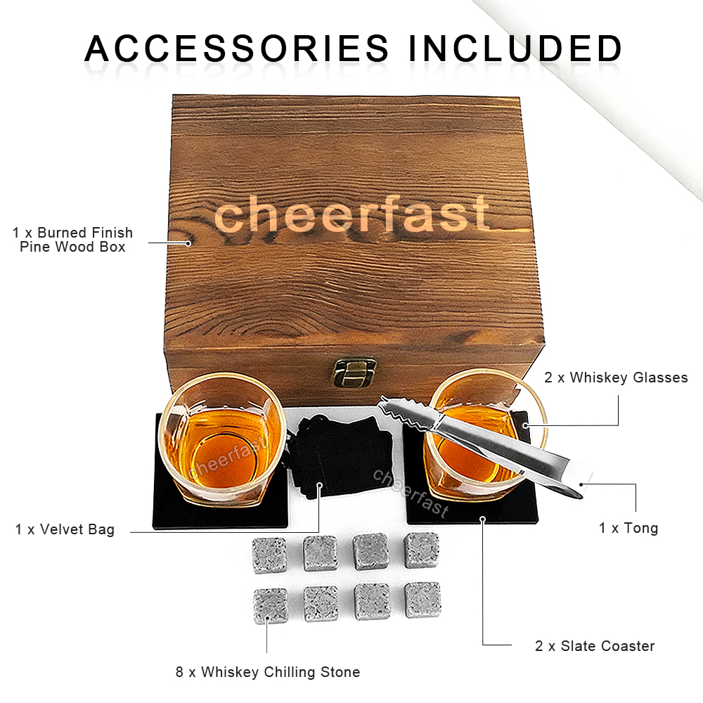 All-in-one glassware gift box. Whisky glasses made for tasting the full flavor of whiskey, burbon, scotch. 8 natural granite wisky stones kit keep the drink saturated without diluting melted ice. The velvet bag will protect chilling rocks for a long time. Tongs and 2 slate table coasters perfectly complement this gorgeous bourbon gift set. Cool whiskey glass gift boxed set will be premium gift for whiskey drinker.