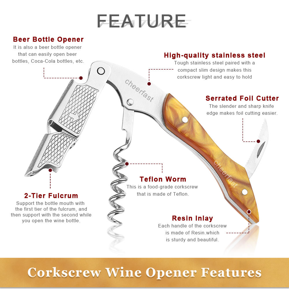 Work on All Cork Types and Beer Bottles :The resin handle wine waiter corkscrew that can handle an older, natural, fragile, or synthetic cork very well. Features integrated of wine opener, beer opener, and foil cutter, multi-functional and professional corkscrew.