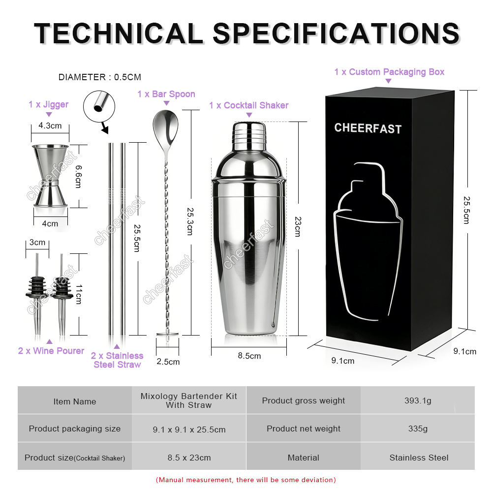 This 7pcs cocktail shaker set includes all the bartender accessories, help you create drinks made from a wide variety of liquors like Whiskey, Tequila, Gin, Rum, Brandy, and more.
