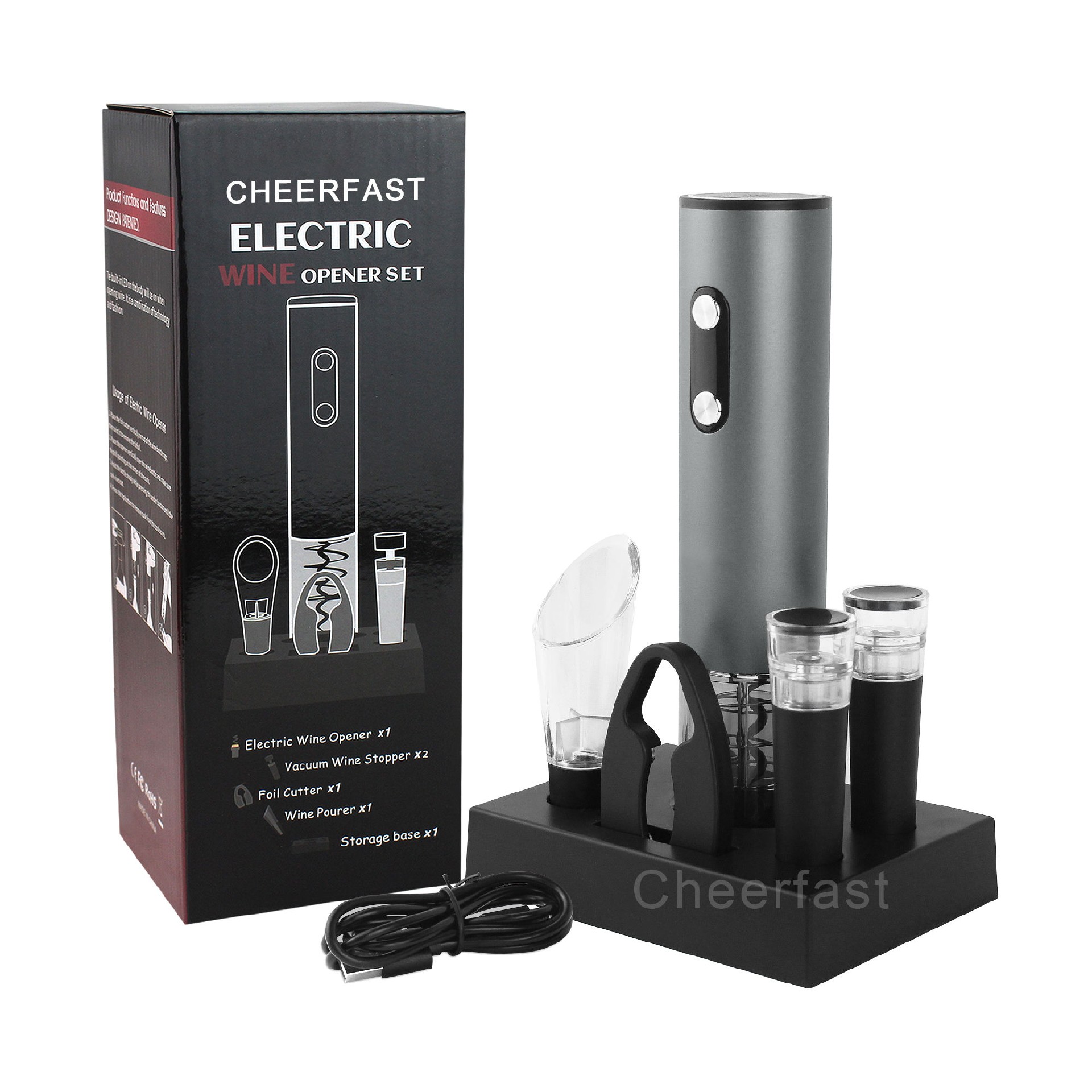 Wine Opener Kit: Electric Wine Bottle Opener Set includes 1pc storage base, 1pc foil cutter, 1pc wine pourer and 2pcs vacuum stoppers to preserve the freshness of your opened wine bottles.