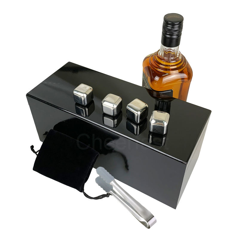 also have 4pcs stainless steel ice cubes and velvet pouch as well as tong inside, conveniently for your drink iced whiskey and storage wine. We support custom your color, size and logo box, if you will need to custom a wooden box for your products then please send us an inquiry.