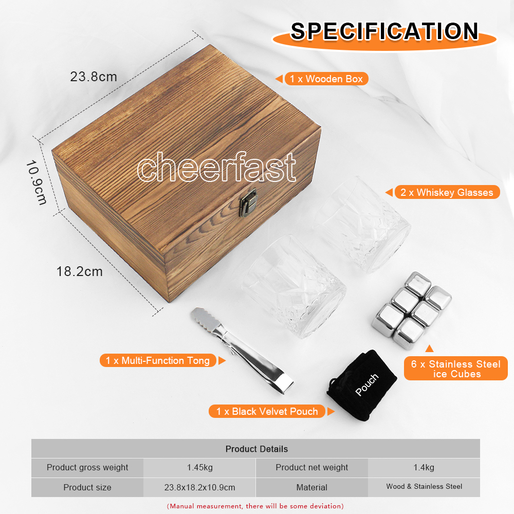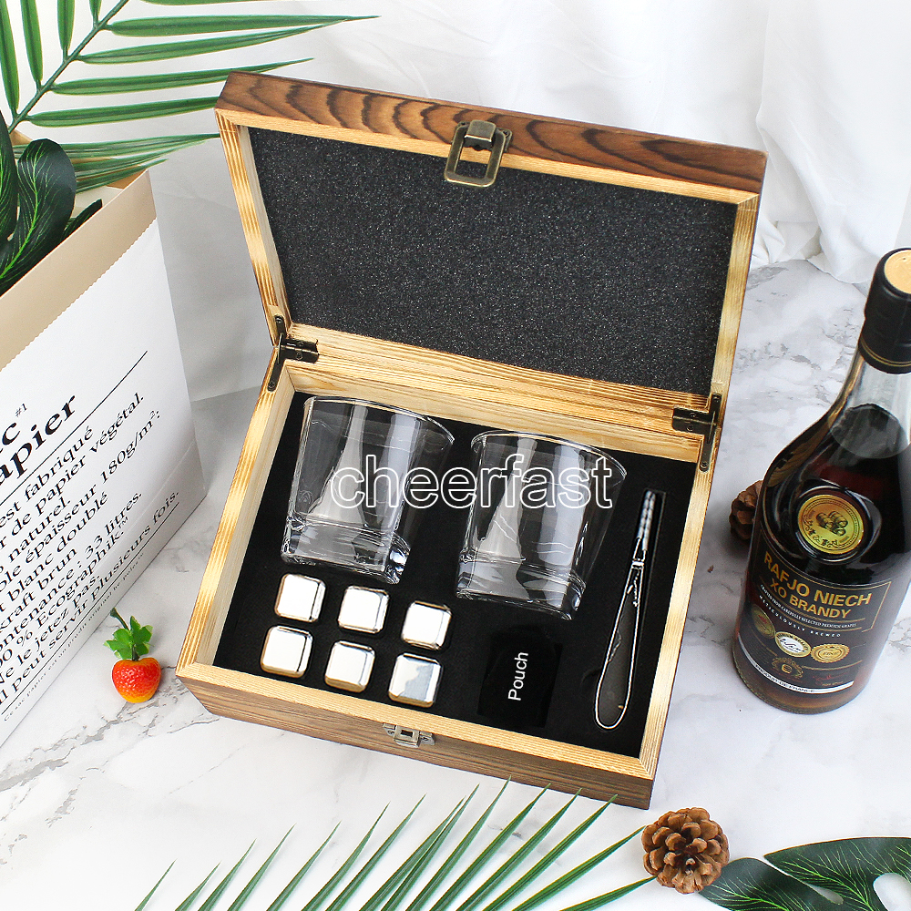 *COMPLETE PACKAGE - As a perfect whiskey gift for men dad husband, 6 stainless steel ice cubes, 2 crystal whiskey glasses , 1 tong and 1 black velvet bag (Easy to use and store), 1 Naturally burned pine wood box (very sturdy, protecting the product inside from damage during shipping.)