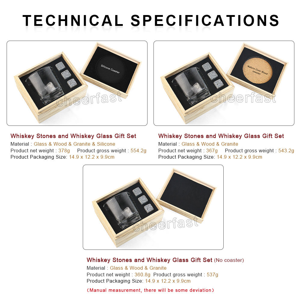 The perfect gift:our whiskey glass with whiskey stones set are individually packaged and support low MOQ for custom logos and designs on both the glasses and packaging boxes. High-quality and cost-effective, they make excellent gifts for Father's Day, Valentine's Day, weddings, promotional events, and corporate events.