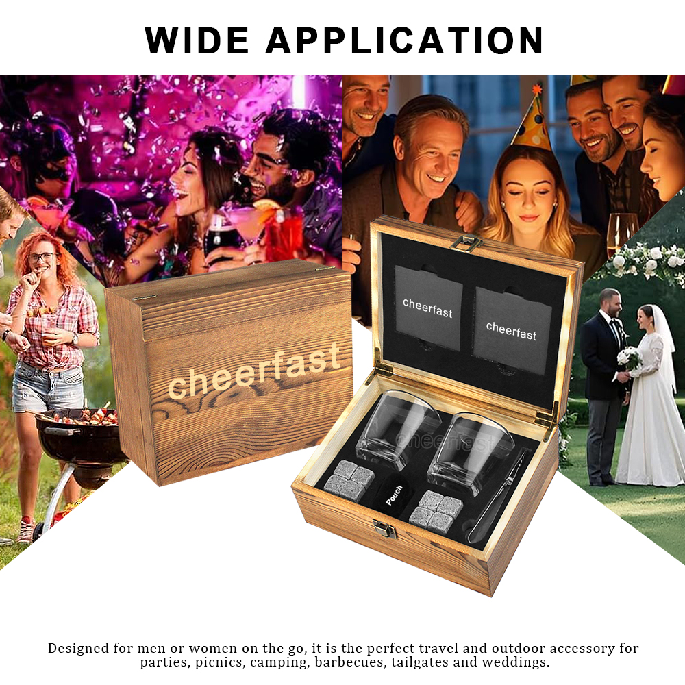 All-in-one glassware gift box. Whisky glasses made for tasting the full flavor of whiskey, burbon, scotch. 8 natural granite wisky stones kit keep the drink saturated without diluting melted ice. The velvet bag will protect chilling rocks for a long time. Tongs and 2 slate table coasters perfectly complement this gorgeous bourbon gift set. Cool whiskey glass gift boxed set will be premium gift for whiskey drinker.