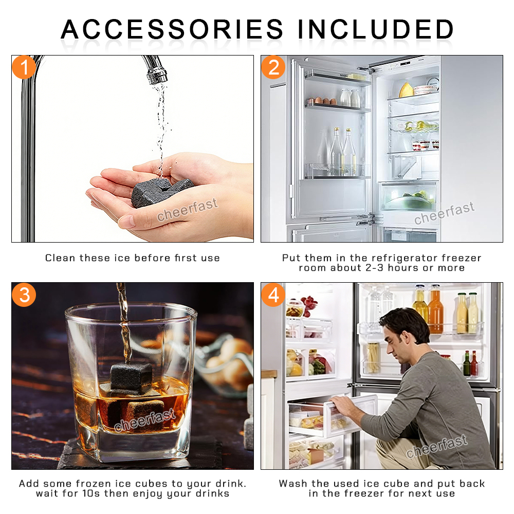Easy to Use Design: First, wash the granite stones and put them in a Velvet bag. Then, refrigerate for 2-3 hours. When you want to drink whiskey, add some frozen ice cubes to your drink. Wait for 10 seconds and then enjoy your drink. After use, simply wash it again and put it in the refrigerator.